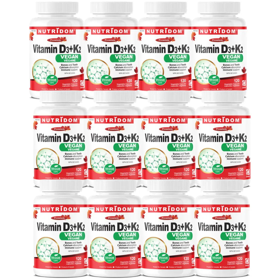 Nutridom Vitamin D3+K2 Vegan is carefully sourced from lichen (Vitamin D3) and natto (Vitamin K2 MK-7), providing a fully plant-based, vegan-friendly option. This formula is ideal for individuals looking for clean, non-animal sources of essential vitamins.