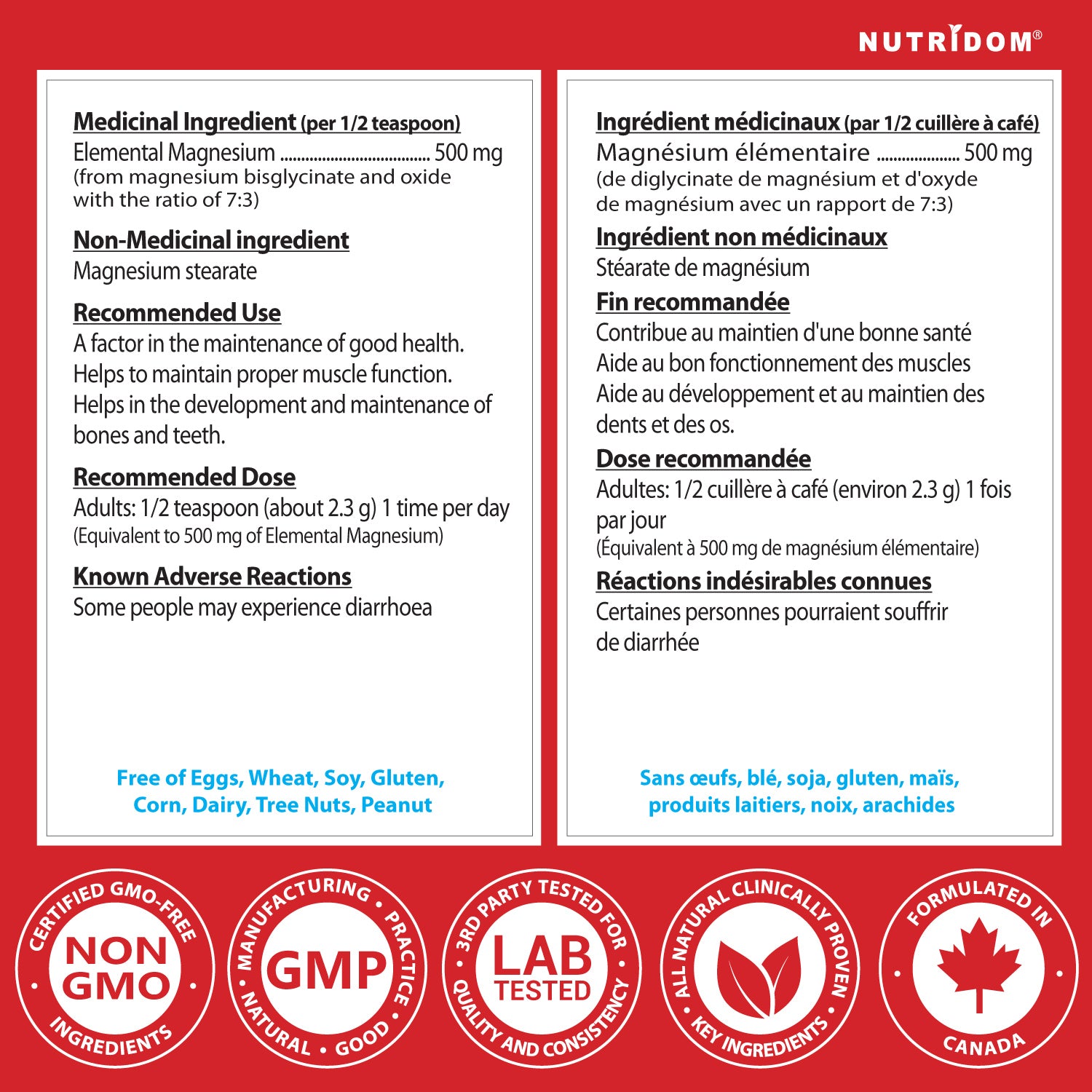Nutridom Magnesium Bisglycinate Powder delivers 500mg of elemental magnesium per ½ teaspoon, in a highly absorbable and stomach friendly chelated form.
