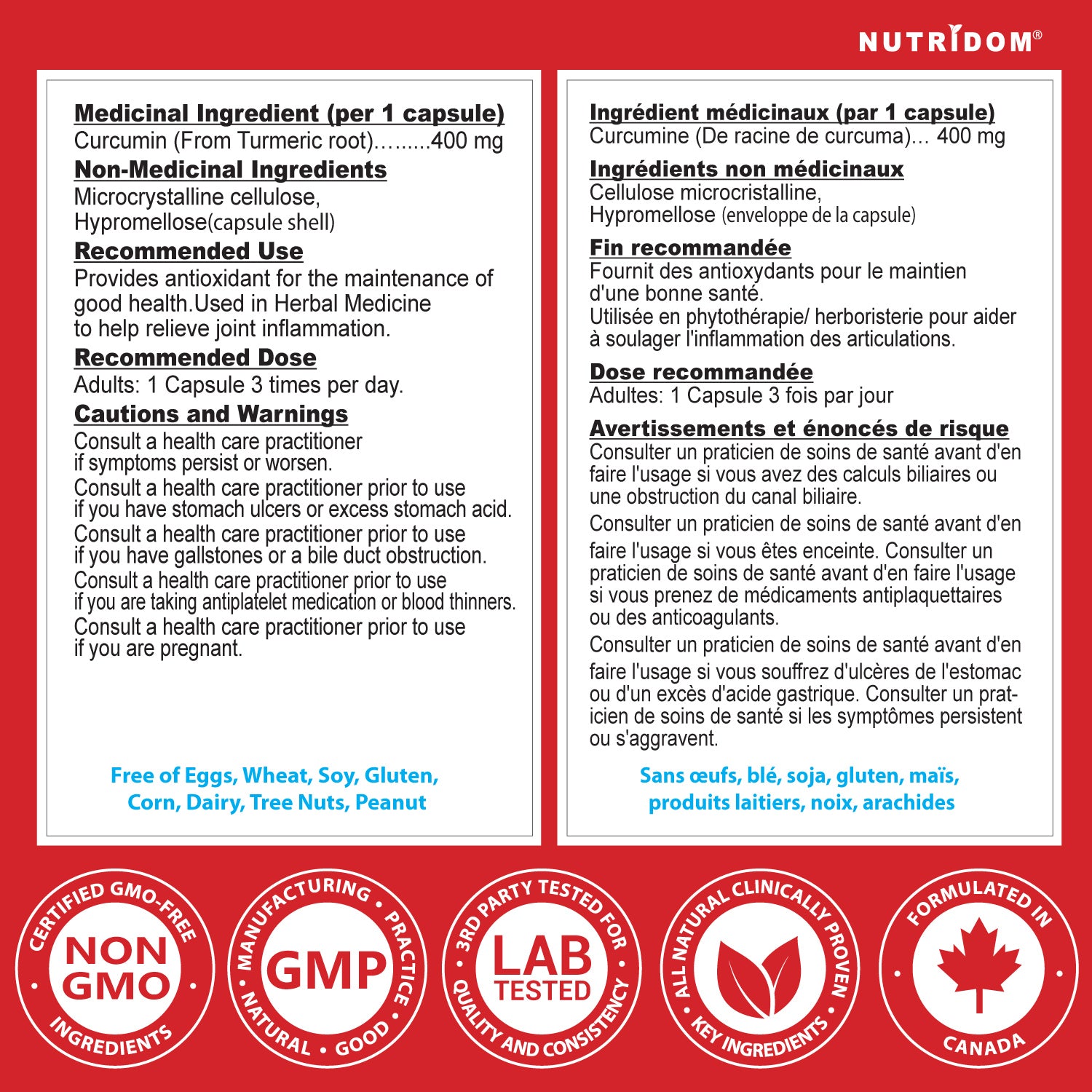 A: Nutridom Turmeric Curcumin 400 mg is a high-potency supplement designed to help alleviate joint inflammation and provide a range of health benefits. Each capsule contains 95% curcuminoids and is Non-GMO, vegan, gluten-free, soy-free, and dairy-free.