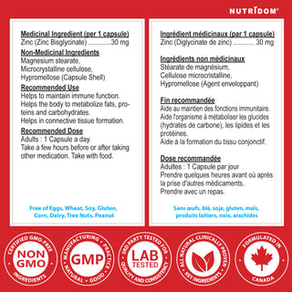 Nutridom Zinc Bisglycinate 30 mg | Chelated Zinc | Immune Support | 60 Vcaps