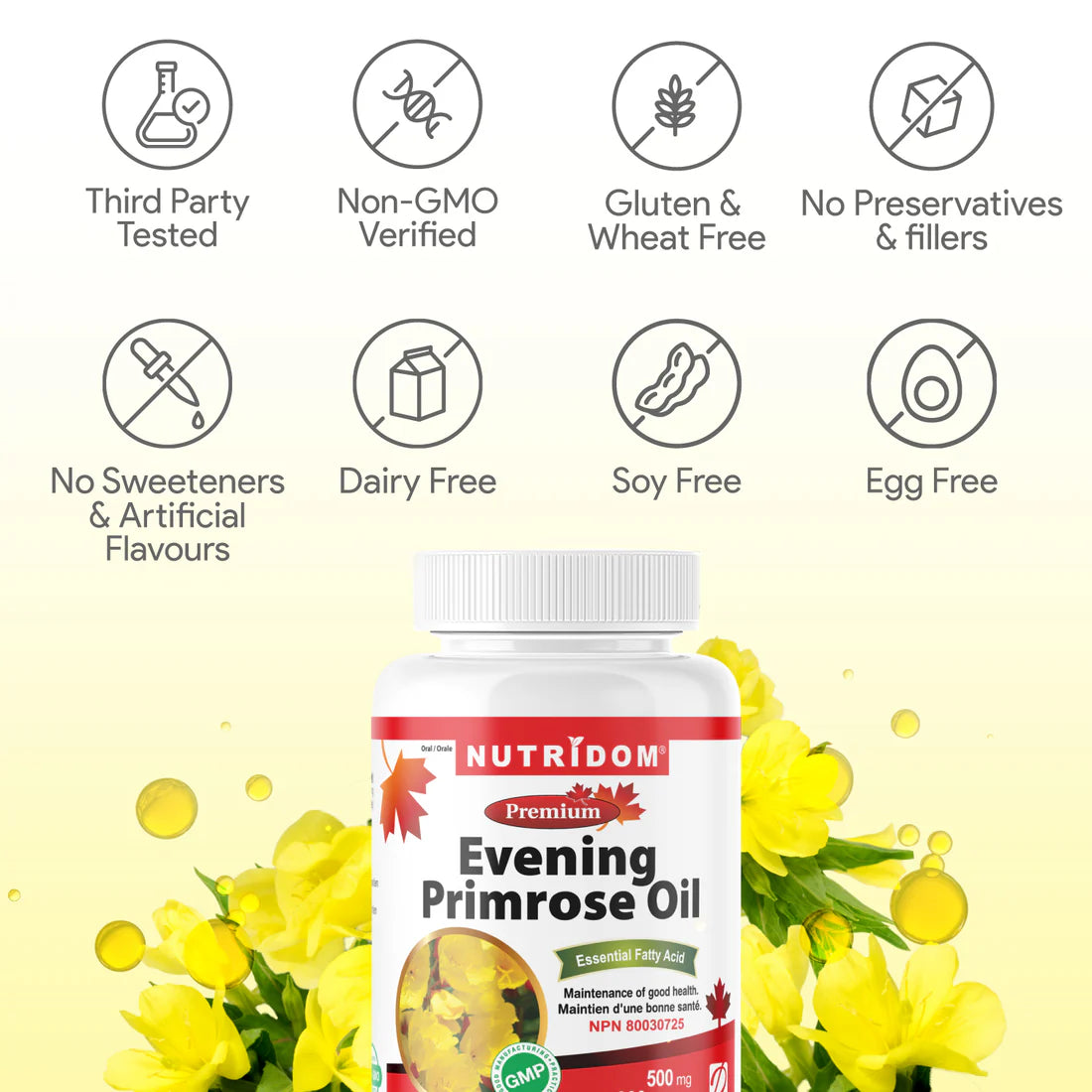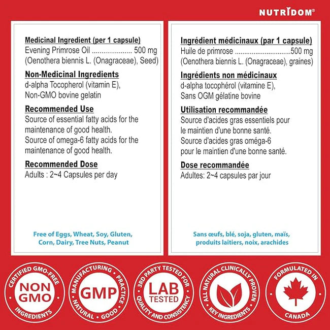 Nutridom Evening Primrose Oil is made in Canada under strict quality standards. The formula is non-GMO and produced in a facility that follows Good Manufacturing Practices (GMP), ensuring purity and safety.