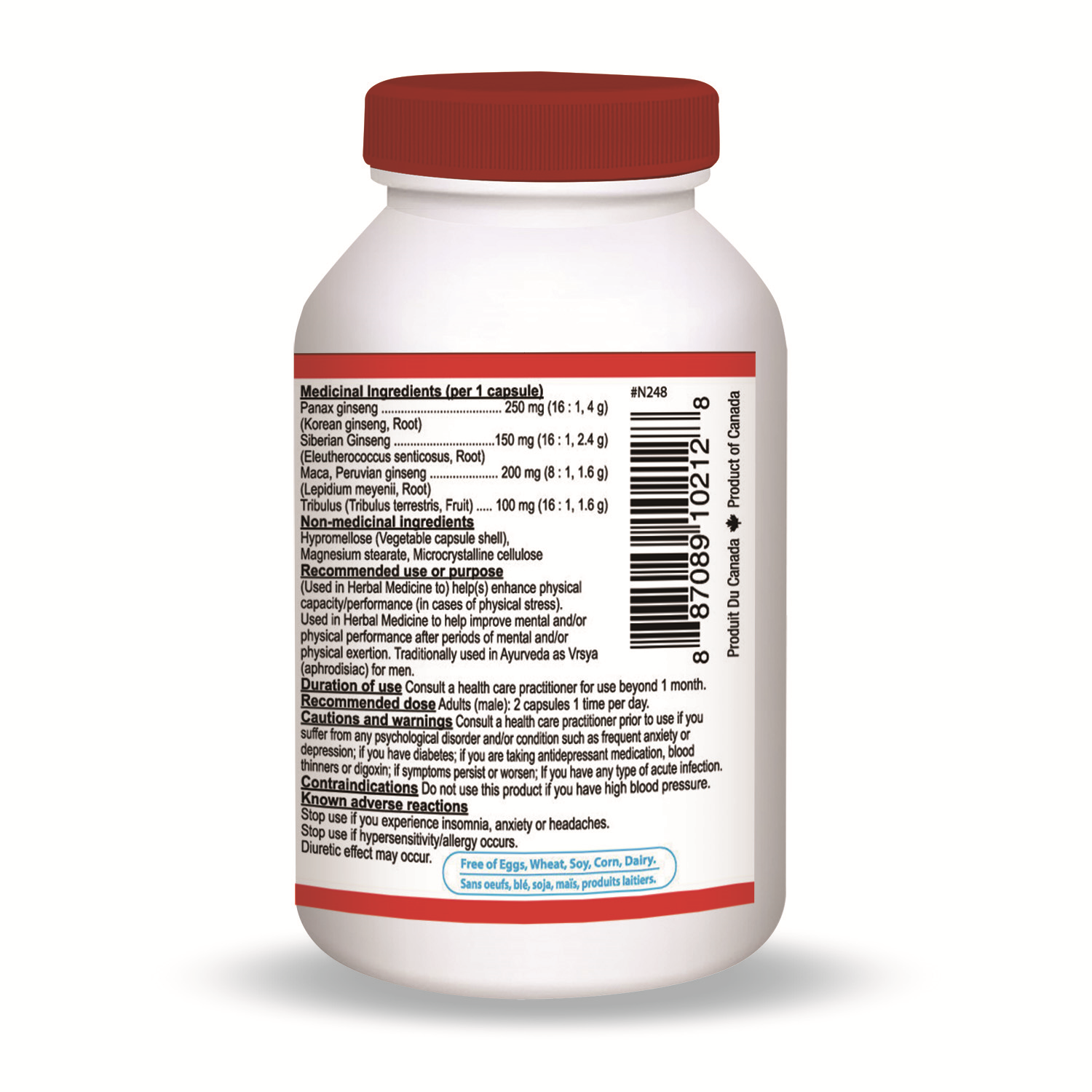 This blend unites the energy-supporting properties of Panax Ginseng, the endurance-enhancing qualities of Maca, the adaptogenic benefits of Siberian Ginseng, and the vitality support of Tribulus Terrestris, creating a synergistic formula for those seeking natural support for an active lifestyle.