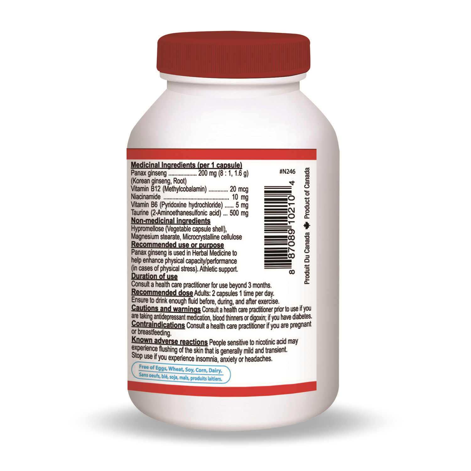 This formula combines high-quality Panax Ginseng root extract with taurine and essential B-vitamins to help maintain physical capacity, focus, and overall well being. Traditionally used in herbal wellness, Panax Ginseng is valued for its adaptogenic properties, while taurine and B-vitamins play a role in energy metabolism.