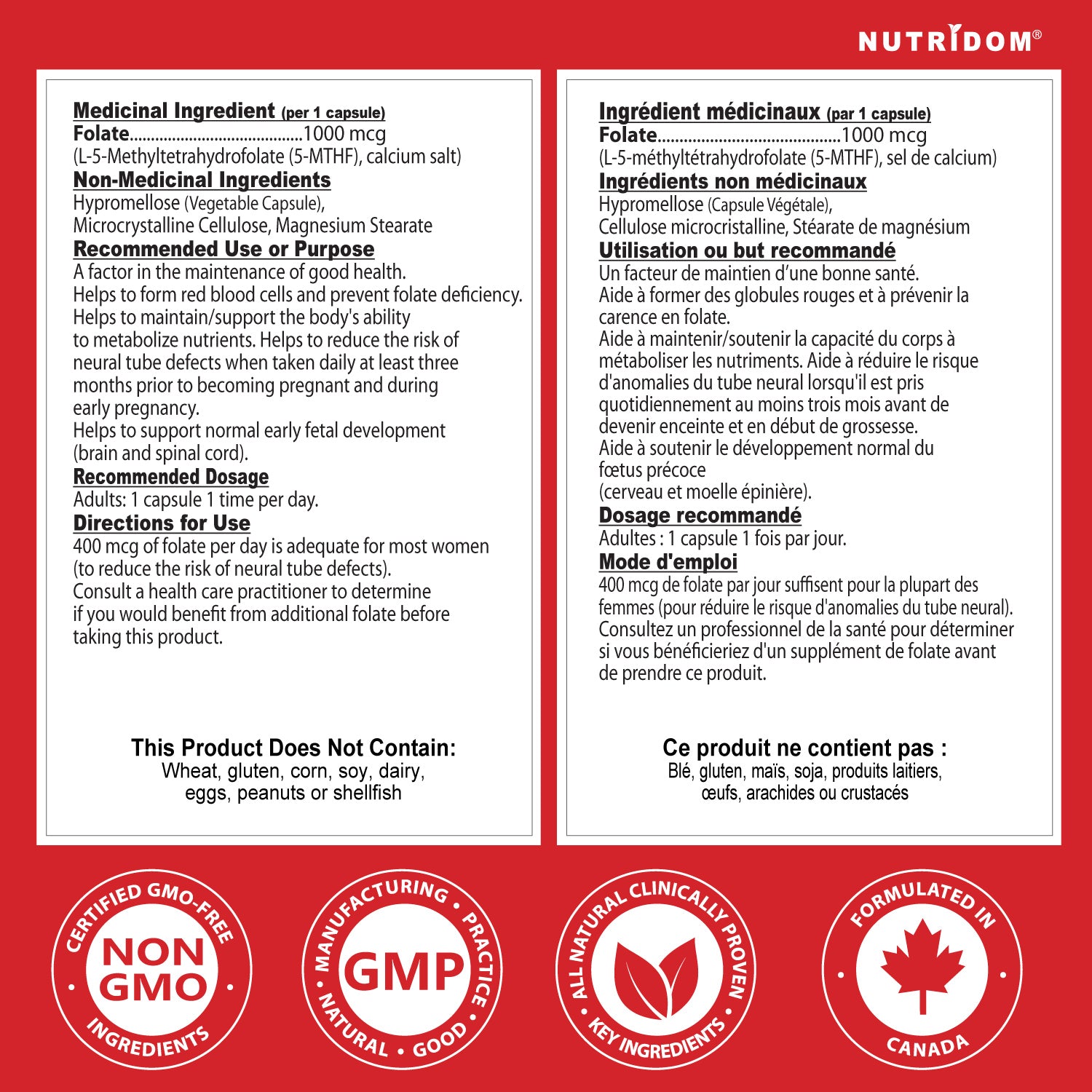 Nutridom Methyl Folate provides 1000 mcg of L-5-MTHF, the active and most bioavailable form of folate. Unlike synthetic folic acid, L-5-MTHF does not require additional metabolic conversion, making it an efficient folate option for daily nutritional support.