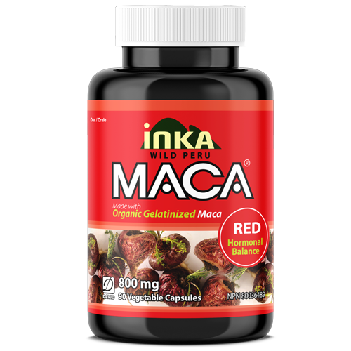InkaMaca Organic Red Maca is a premium maca supplement sourced directly from the Andes Mountains of Peru. This certified organic red maca root provides 800mg per capsule of gelatinized maca for superior absorption and digestibility. Red maca is considered the most balancing and restorative of all maca varieties, supporting hormonal health, energy, mood, and overall vitality for both men and women. Health Canada approved (NPN 80036489). 90 vegan capsules.
