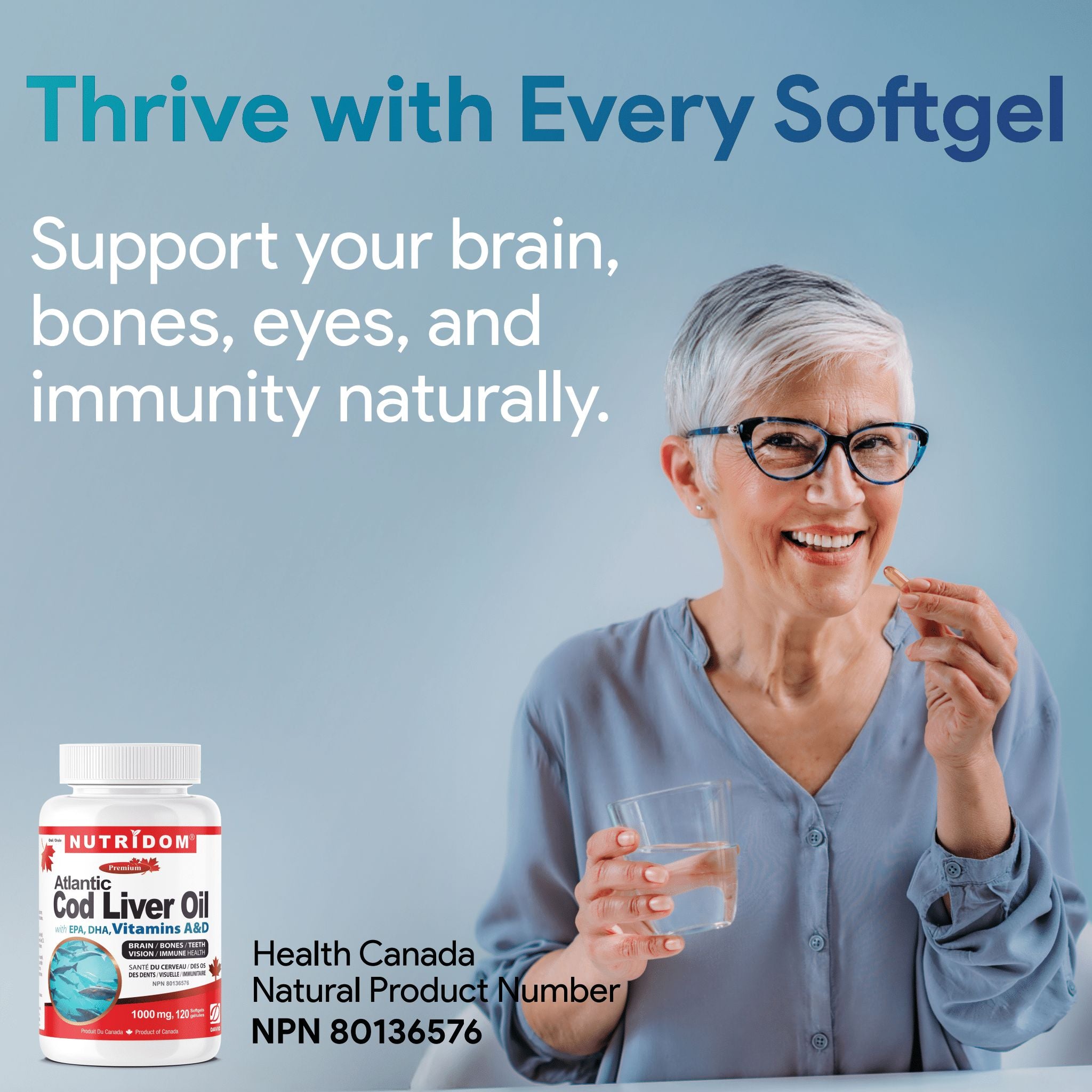 Nutridom Atlantic Cod Liver Oil delivers EPA, DHA, and naturally occurring Vitamins A and D, essential nutrients that help support overall wellness. Sourced from Atlantic cod, this supplement offers convenient daily support for immune health, brain function, and bone maintenance as part of a balanced diet.