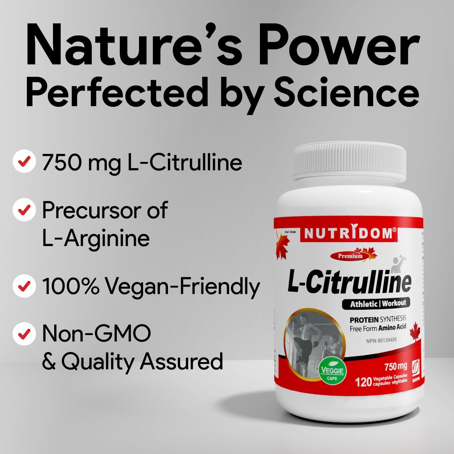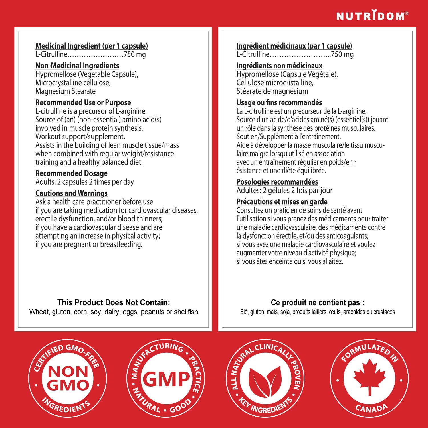 Nutridom L-Citrulline provides 750mg of free-form L-Citrulline per capsule, a naturally occurring amino acid involved in protein metabolism and nitric oxide production.