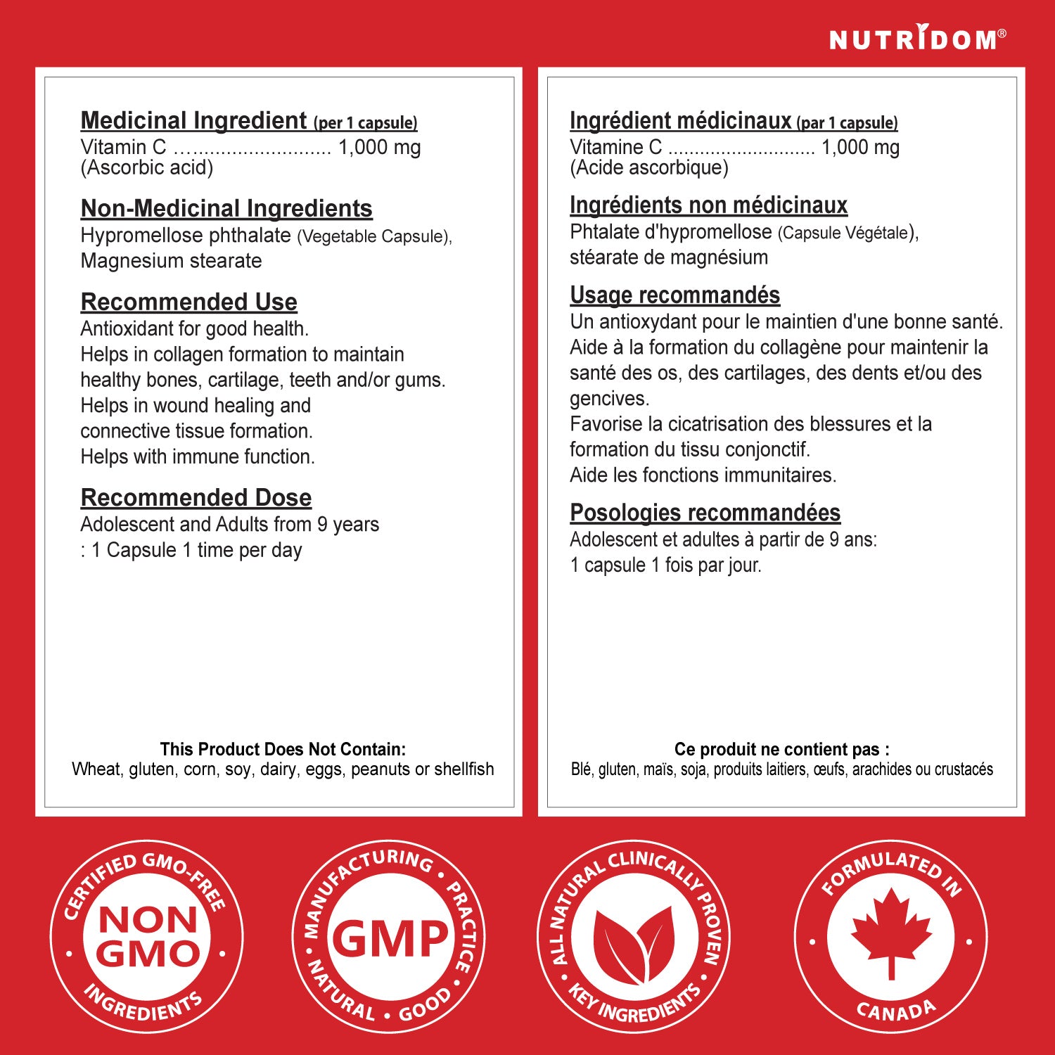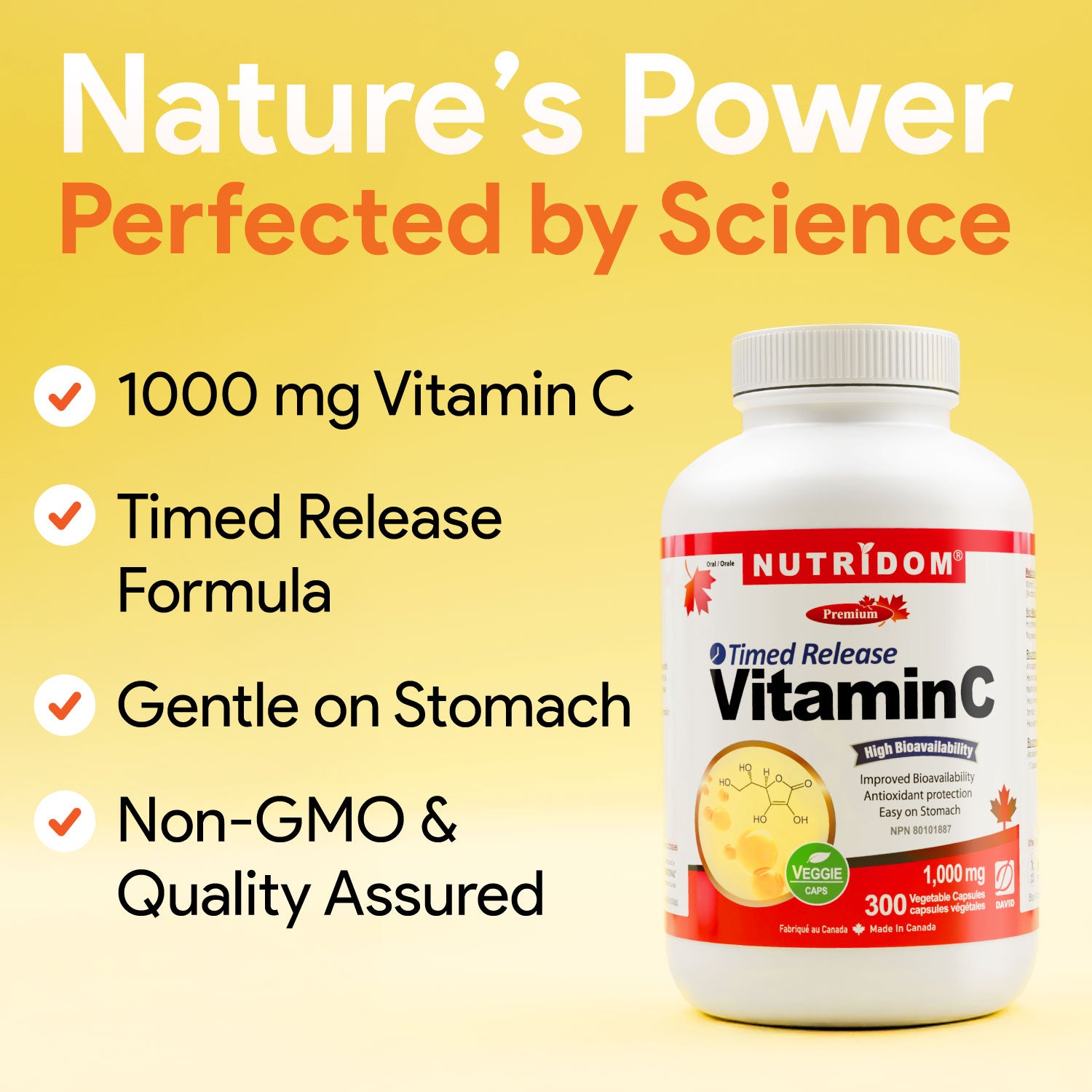 A: Nutridom Time-Release Vitamin C 1000 mg is a premium dietary supplement designed to gradually release vitamin C for optimal absorption. Each bottle contains 120 non-GMO vegetable capsules that support immune function, antioxidant protection, collagen synthesis, and overall health.