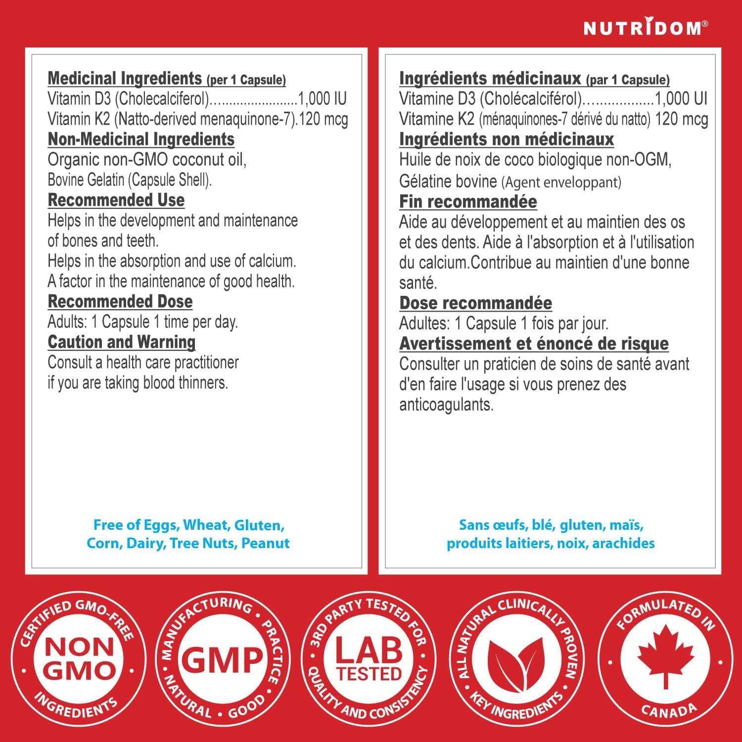 Nutridom Vitamin K2 + D3 delivers 120 mcg of K2 (MK-7) and 1000 IU of Vitamin D3 per softgel. This pairing supports the maintenance of healthy bones and teeth while contributing to normal immune function. MK-7 is a highly bioavailable form of Vitamin K2, known for its longer lasting activity in the body.