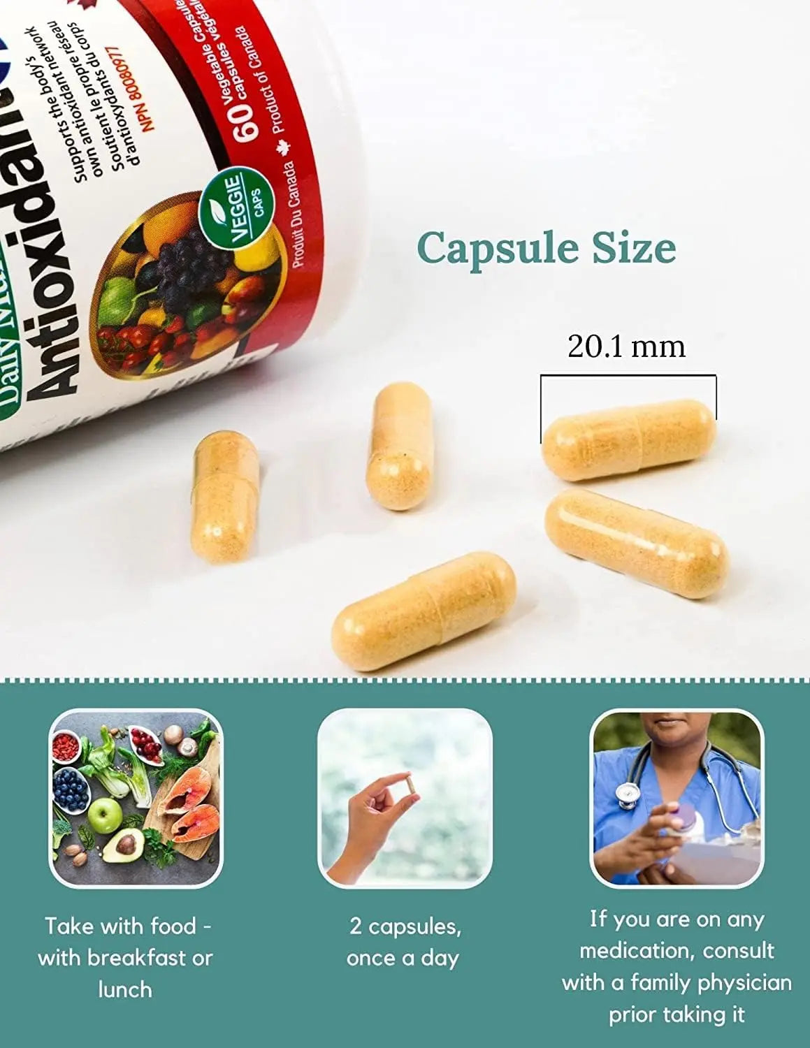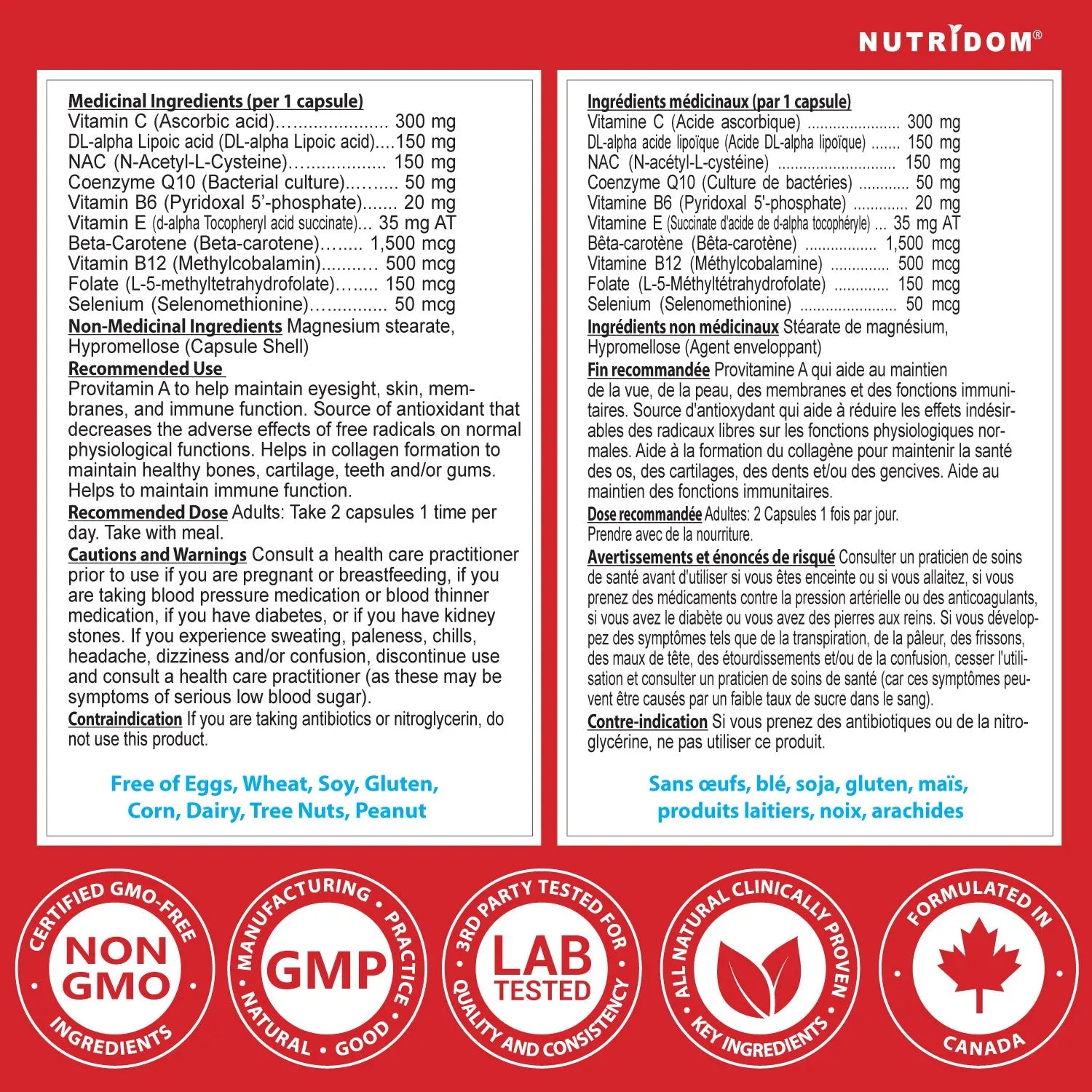 Chaque capsule contient des ingrédients clés tels que la coenzyme Q10, la N-acétylcystéine (NAC), l'acide alpha-lipoïque, le bêta-carotène, la vitamine B12, la vitamine B6, la vitamine E, les folates et le sélénium. Ces nutriments sont reconnus pour leur capacité à contribuer au maintien de fonctions cellulaires saines, au métabolisme énergétique et au soutien du système immunitaire.
