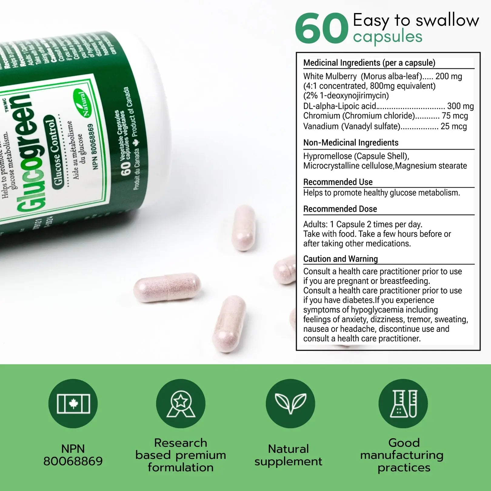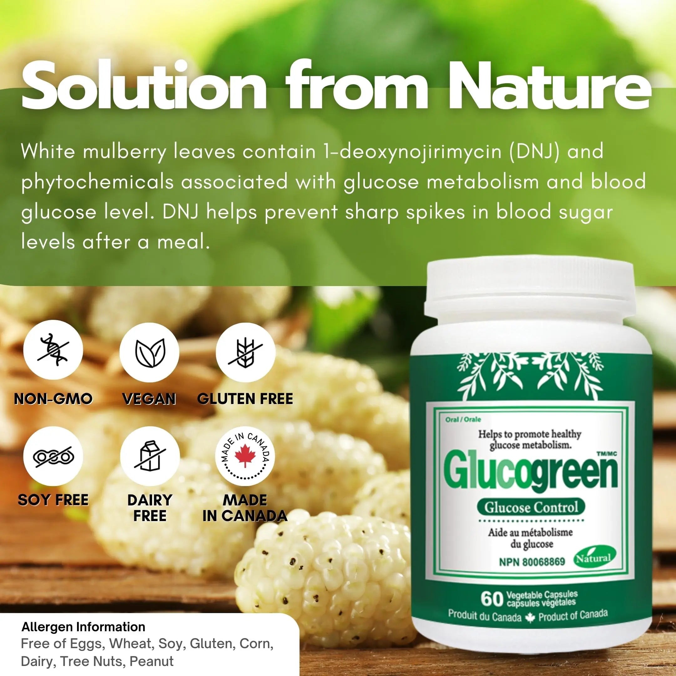 *These statements have not been evaluated by Health Canada or the FDA. This product is not intended to diagnose, treat, cure, or prevent any disease. GlucoGreen supports healthy glucose metabolism in individuals with levels already in normal range and should be used as part of a healthy lifestyle including balanced diet and regular exercise.
