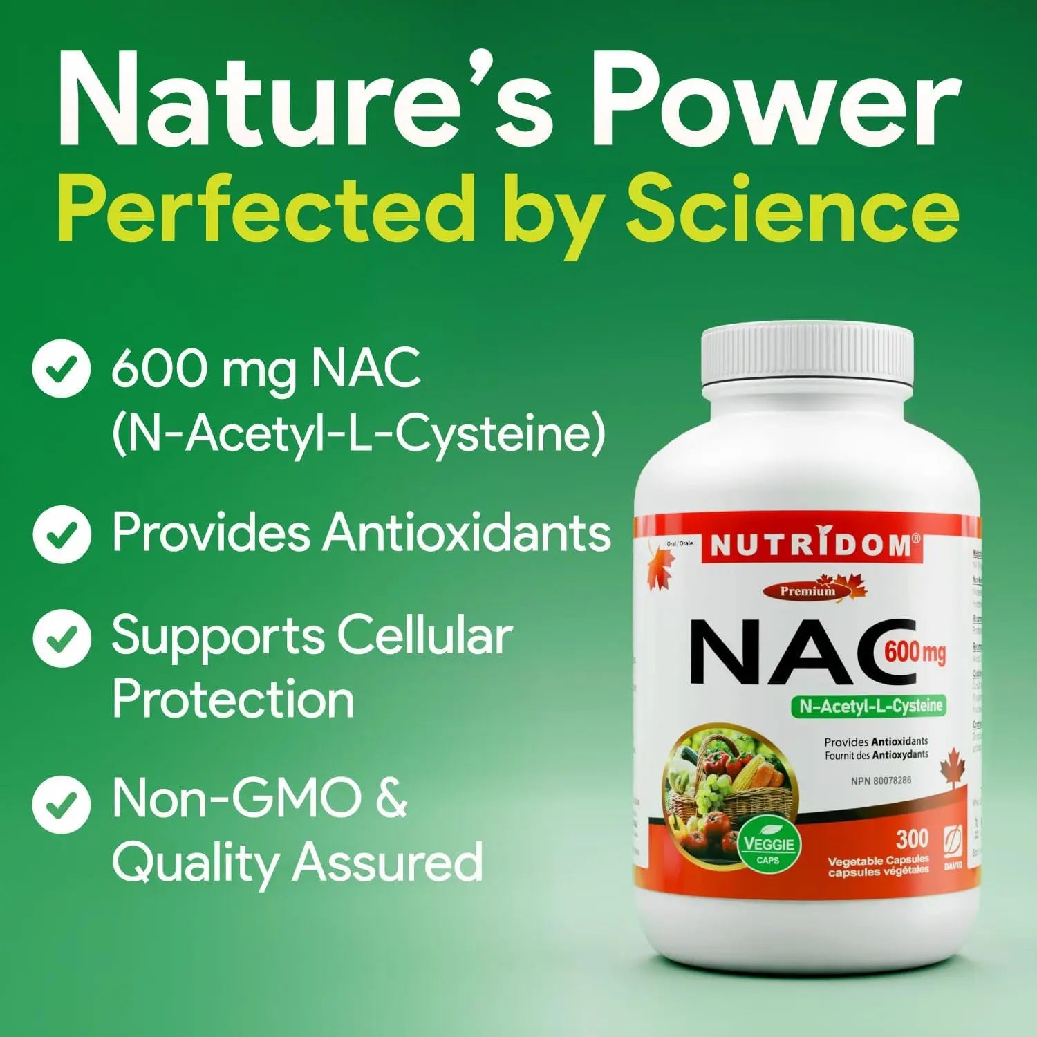 Each capsule contains 600mg of N-Acetyl-L-Cysteine (NAC). Source of cysteine for the synthesis of glutathione (an antioxidant). Antioxidant. Liver support. Mucolytic agent to help thin and loosen mucus. Health Canada approved (NPN 80078286). Vegan hypromellose capsule. Made in Canada. 2-pack: 2 x 300 capsules = 600 capsules total (600 day supply at 1 capsule per day).