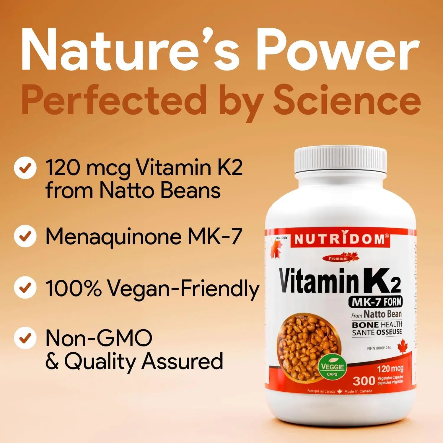 Each capsule contains 120mcg of vitamin K2 as menaquinone-7 (MK-7) derived from natto (fermented soybeans). Vitamin K2 MK-7 is a highly bioavailable form that activates proteins responsible for directing calcium to bones and teeth while preventing calcium deposits in soft tissues like arteries. This essential nutrient supports bone mineralization, bone density, and cardiovascular wellness. 100% plant-based and vegan-friendly. Health Canada approved (NPN 80091254). Made in Canada. 300 vegan capsules.