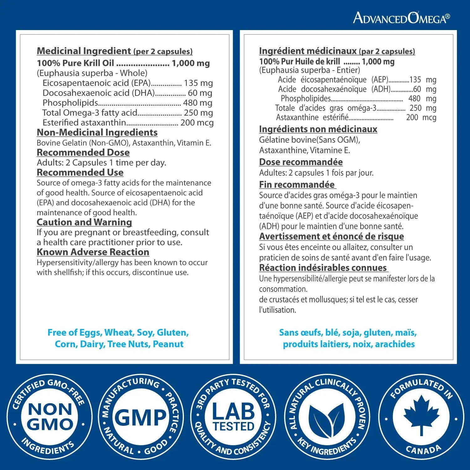This product contains 100% pure Antarctic krill oil (Euphausia superba) providing phospholipid-bound omega-3 fatty acids for superior absorption. Each 2-capsule serving delivers 1,000mg of pure krill oil with 135mg EPA, 60mg DHA, 480mg phospholipids, and 200mcg natural astaxanthin. Unlike fish oil, krill oil omega-3s are bound to phospholipids, which enhances absorption and bioavailability. The natural astaxanthin provides powerful antioxidant protection. Supports cardiovascular health, brain function, and joint mobility. Health Canada approved (NPN 80037865). Sustainably harvested from pristine Antarctic waters. Made in Canada. 60 capsules (30-day supply). Non-GMO.