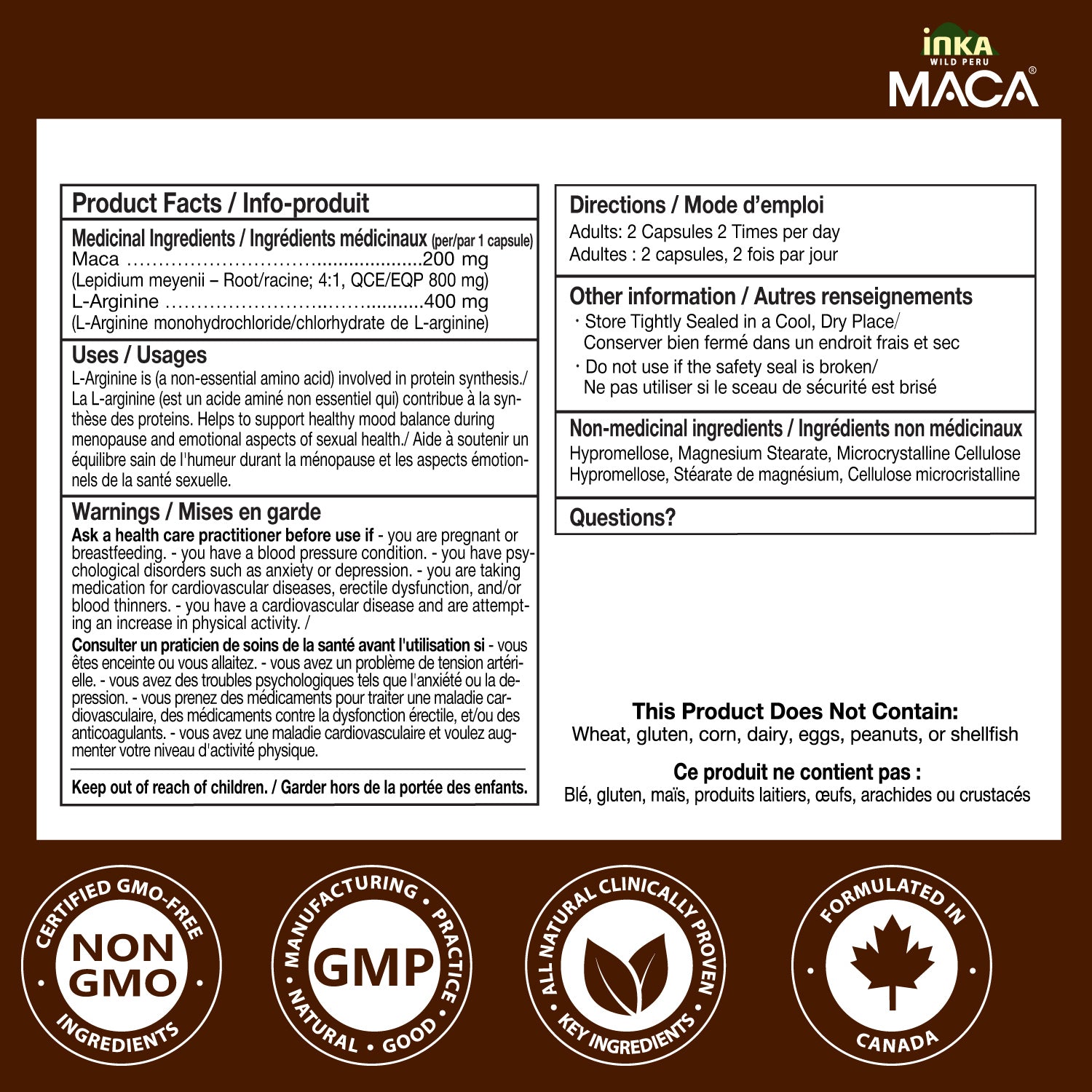 Inka Maca® Black Maca with L-Arginine combines high quality Peruvian black maca root with the amino acid L-arginine to help support natural energy, stamina, and overall vitality. This dual action formula is designed for individuals who want to stay active, focused, and motivated throughout the day.